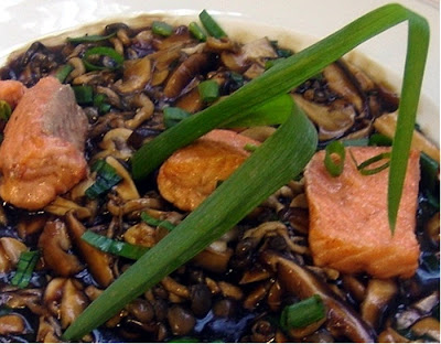 Corte o peixe, tempere e passé no amido de milho. Grelhe na manteiga aquecida e reserve. Fatie os cogumelhos e desflore o shimeji. Na mesma panela junte os cogumelos e deixe refogar. Entre com o caldo de gainha e o molho shoyu. Dissolva um pouco de amido em agua e junte ao molho para encorpar. Corrija de sal, se precisar e junte a cebolinha picada. Junte o peixe e sirva