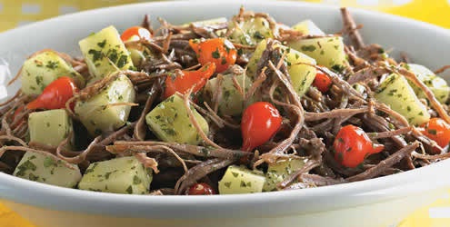 Em uma panela, aqueça o óleo e doure a carne. Acrescente o louro, o alho, o caldo de legumes e água suficiente para o cozimento. Tampe a panela e cozinhe a carne até ficar macia. Reserve o caldo da panela. Desfie a carne. No caldo reservado, cozinhe o chuchu por três minutos. Se for preciso, acrescente mais água. Em uma saladeira, coloque a carne desfiada, o chuchu e tempere com azeite. Misture a salsa e a pimenta-de-bico e sirva.